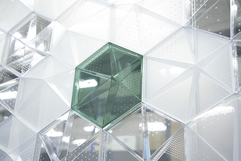 六角形の本体に、音が入り込む穴を空けた6つの部屋を設け、それぞれの部屋の中で音同士を相殺させています。本体が透明かつ部屋の形がすべて違うのはデザイン性を重視したためで、弊社代表の落合のこだわりが詰まっています。ガラスの硬い質感を残さないと、ガラスに貼れる吸音材とは呼べません。見た目を気にしないなら非透明な吸音材(既製品)を貼ればいいという話になってしまいますので。透明かつ硬い質感、そしてカラーバリエーションを持たせることでデザイン性と吸音性能を両立させています。